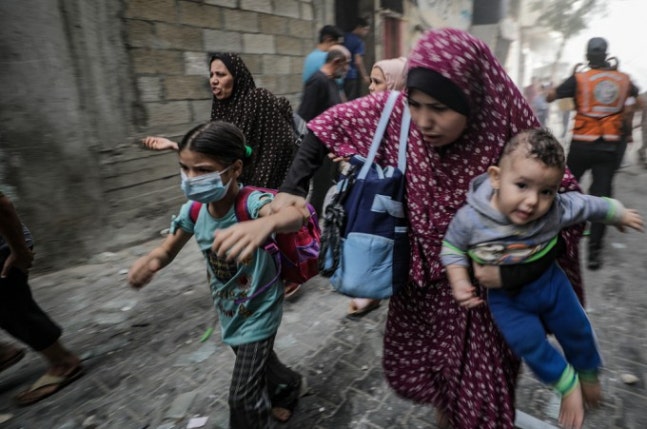 이스라엘 공습에 어린이 안고 대피하는 가자지구 주민들. 연합뉴스 제공