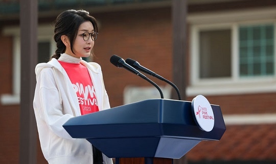 서울 용산구 용산공원 장교숙소에서 열린 2023 핑크 페스티벌에 참석해 축사하고 있다.