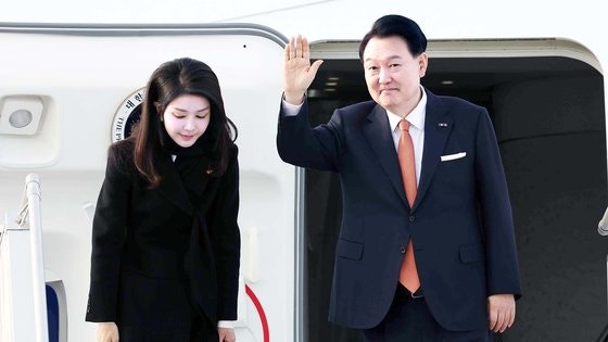 윤석열 대통령(오른쪽)과 김건희 여사. 사진은 지난 14일(현지시간) 네덜란드 국빈 방문 일정을 마친 윤 대통령과 김 여사가 암스테르담 스히폴 공항에서 귀국하기 전 전용기인 공군 1호기에서 인사하는 모습. 연합뉴스
