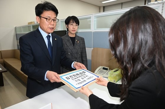 의안과에 김건희 특검법·50억 클럽 특검법 신속 처리 안건 지정 발의서를 제출하고 있다.