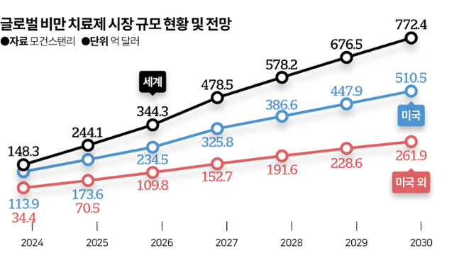벤처캐피털 데일리파트너스의 이승호 대표는 "환자 수와 처방 질환이 정해져 있는 항암제와 달리 비만은 '해피 드럭'이기 때문에 마케팅 확장성이 무궁무진하다"며 "환자 규모는 웬만한 질환보다 거대한데 약가도 비싼 게 시장의 성장성을 높게 보는 이유"라고 분석했다.