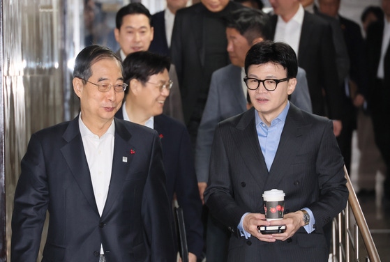 14일 국회에서 열린 고위 당정 협의회 참석하는 한덕수 국무총리와 한동훈 국민의힘 비상대책위원장. 〈사진=연합뉴스〉