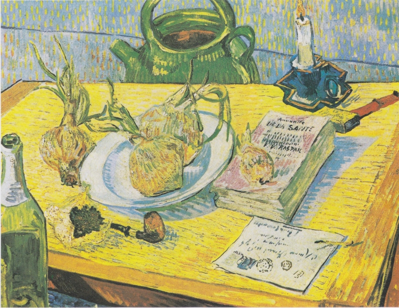 반 고흐는 고갱과 논쟁을 벌인 뒤 극심한 신경쇠약에 빠졌지만, 기력을 회복하자마자 가장 먼저 책 그림을 그렸습니다. <양파 접시가 있는 정물>은 귀를 자르는 사고가 있은 뒤 얼마 지나지 않아 그린 작품으로, 왼쪽에는 빈 압생트 병이 있고, 나무 테이블 위에는 파이프와 종이 담배 봉지, 성냥갑, 양파, 편지, 책, 양초가 놓여 있죠. 테이블 위에 놓인 책의 제목이 『건강 연감』이라는 점이 왠지 모를 애잔함을 자아냅니다.