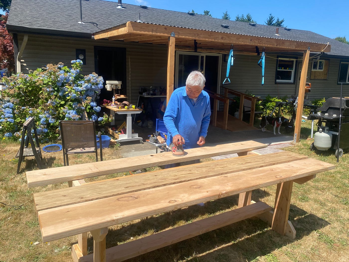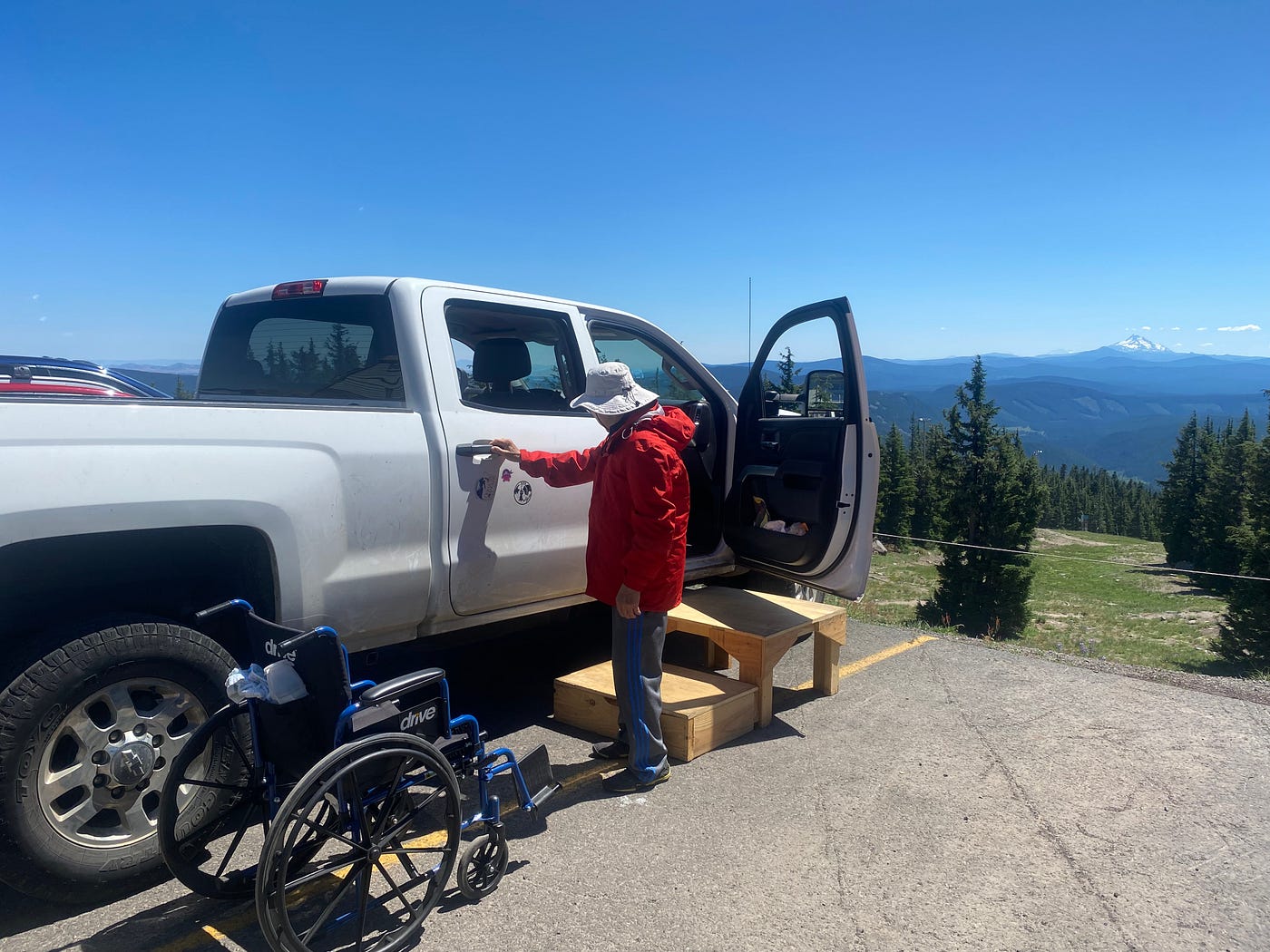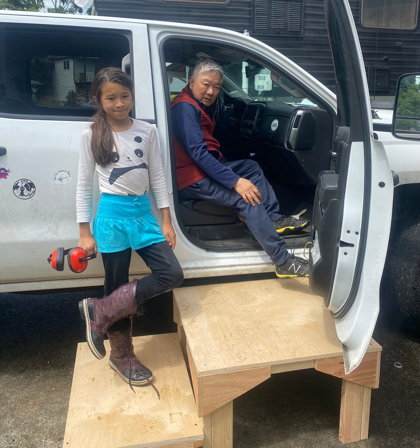 오늘은 그가 내 트럭에 오르도록 돕기 위한 계단을 만들고 있다.