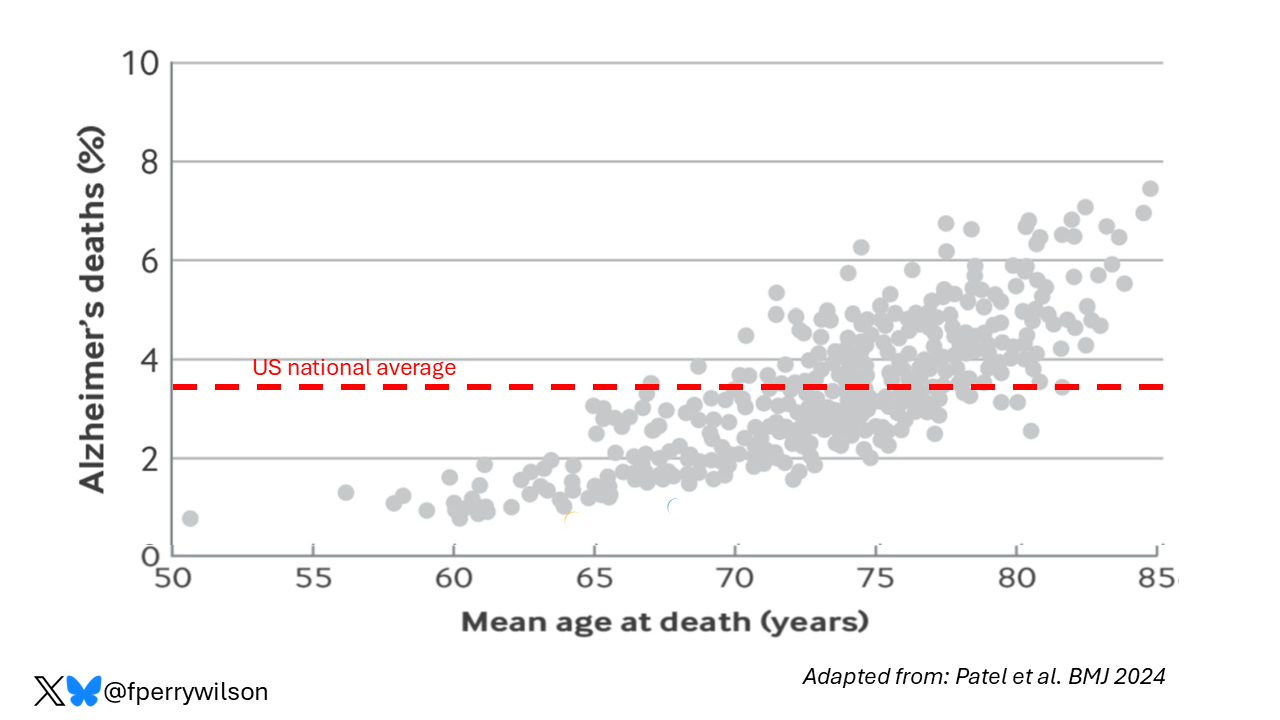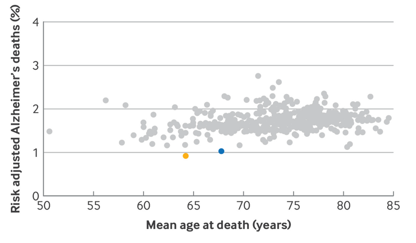 높다고 상상해 보세요. 글쎄요, 그것은 그들이 알츠하이머병으로 사망할 가능성이 낮다는 것을 의미할 수 있고, 물론 사망 연령을 조정하면 약간 도움이 될 수 있지만 완전히는 아닙니다.
