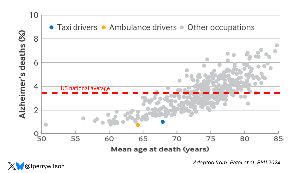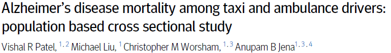 따라서 이러한 결과는 다른 사망한 사람과 비교하여 사망한 택시 운전사로 제한됩니다 . 다시 말해, 알츠하이머병으로 사망하지 않았다면 이 데이터 세트에 포함되려면 다른 원인으로 사망해야 했습니다.