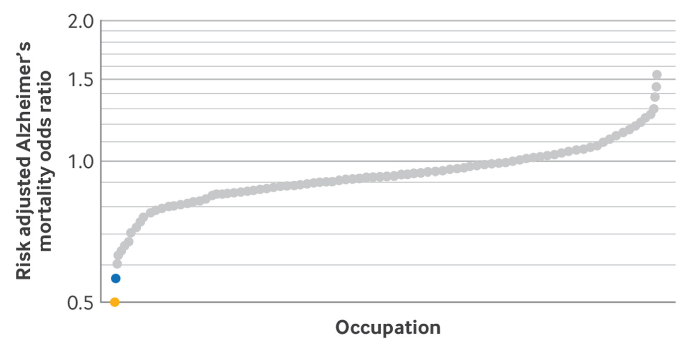 따라서 이 선 위의 점은 사람들이 알츠하이머병으로 사망할 가능성이 상대적으로 높은 직업이고, 이 선 아래의 점은 사람들이 알츠하이머병으로 사망할 가능성이 낮은 직업입니다.
