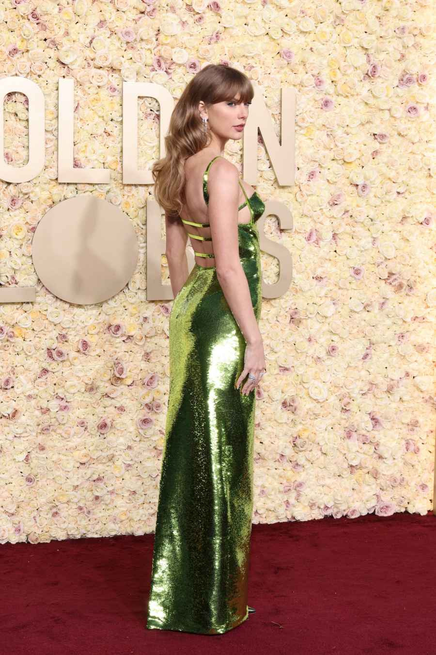 스위프트는 2024년 시상식에서 발코넷 탑과 피팅 스커트가 특징인 녹색 구찌 가운을 입고 화려하게 등장했습니다.