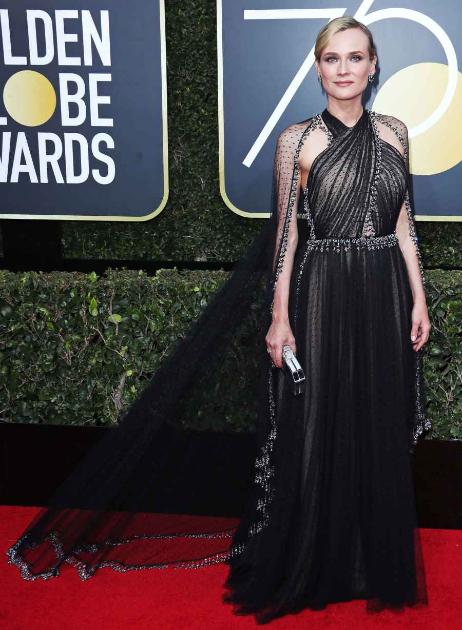 크루거는 2018년 시상식에서 검은색 구슬 장식이 달린 프라다 드레스를 입고 품위 있는 모습을 보였으며, 드레스와 어울리는 케이프도 함께 착용했습니다.