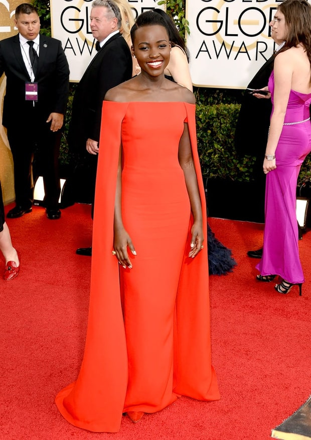 영화 '노예 12년'의 여배우가 랄프 로렌이 디자인한 이 진홍색 케이프를 입고 2014년 쇼의 레드카펫에 등장 하자마자 그녀는