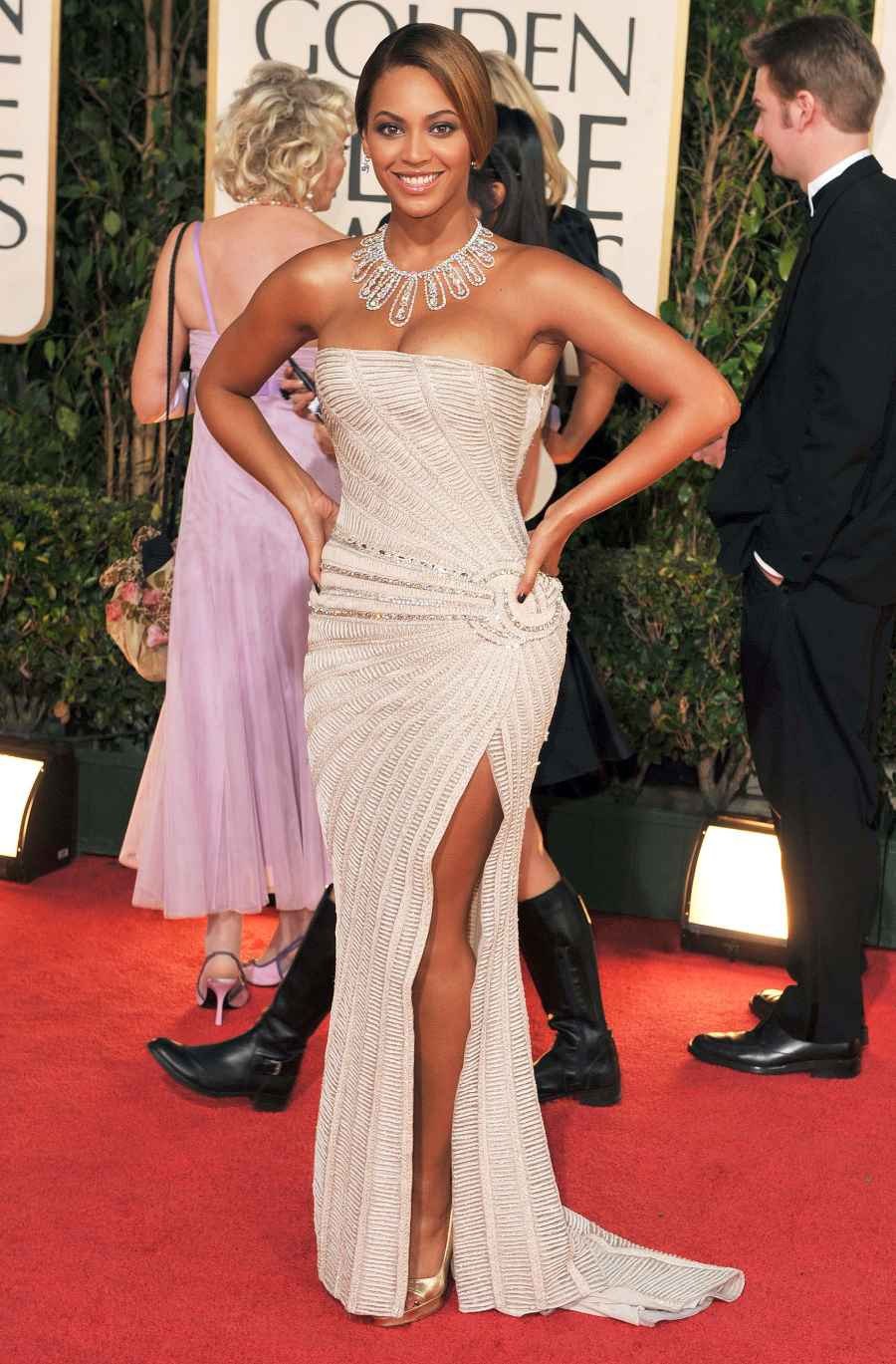 가수는 2009년 골든 글로브 시상식에서 엘리 사브의 스트랩리스 아이보리색 가운과 로레인 슈워츠의 다이아몬드 목걸이를 착용해 놀라운 몸매를