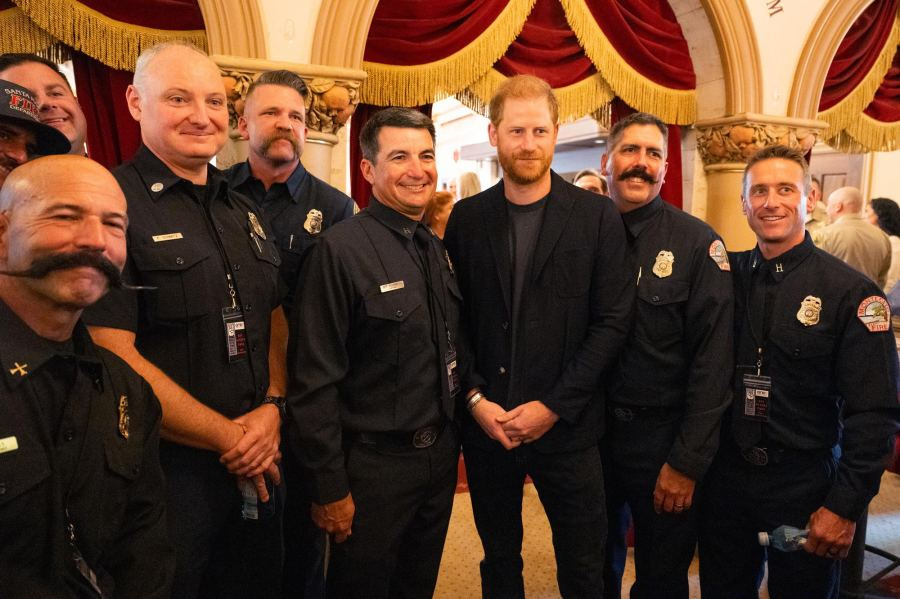 해리 왕자는 2025년 3월 8일 캐나다 극장에서 열린 One805 Rock for Responders! 자선행사에서 구급대원들과 함께 포즈를 취하며 미소를 지었습니다.