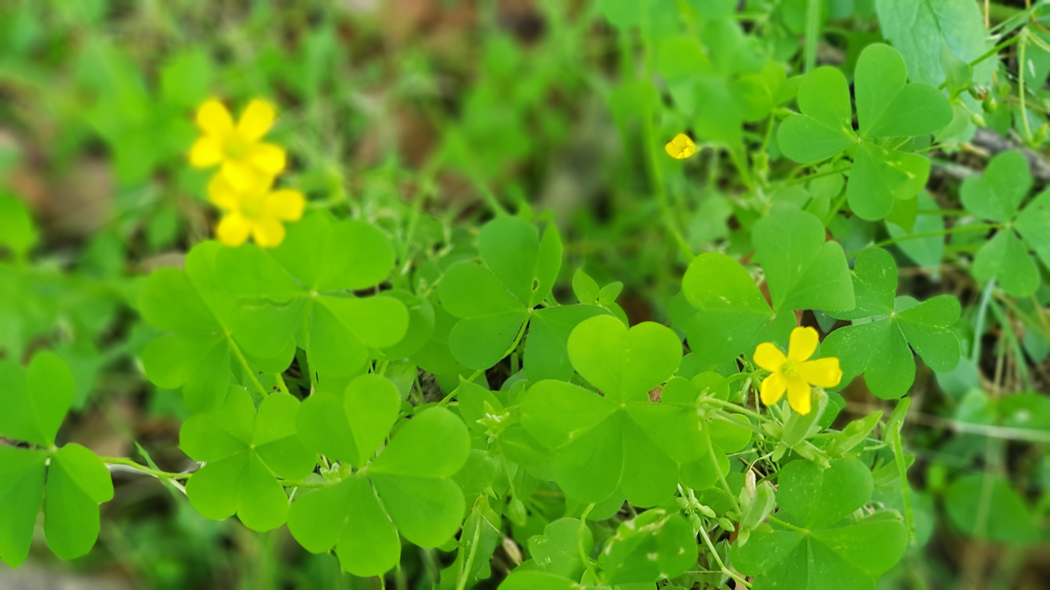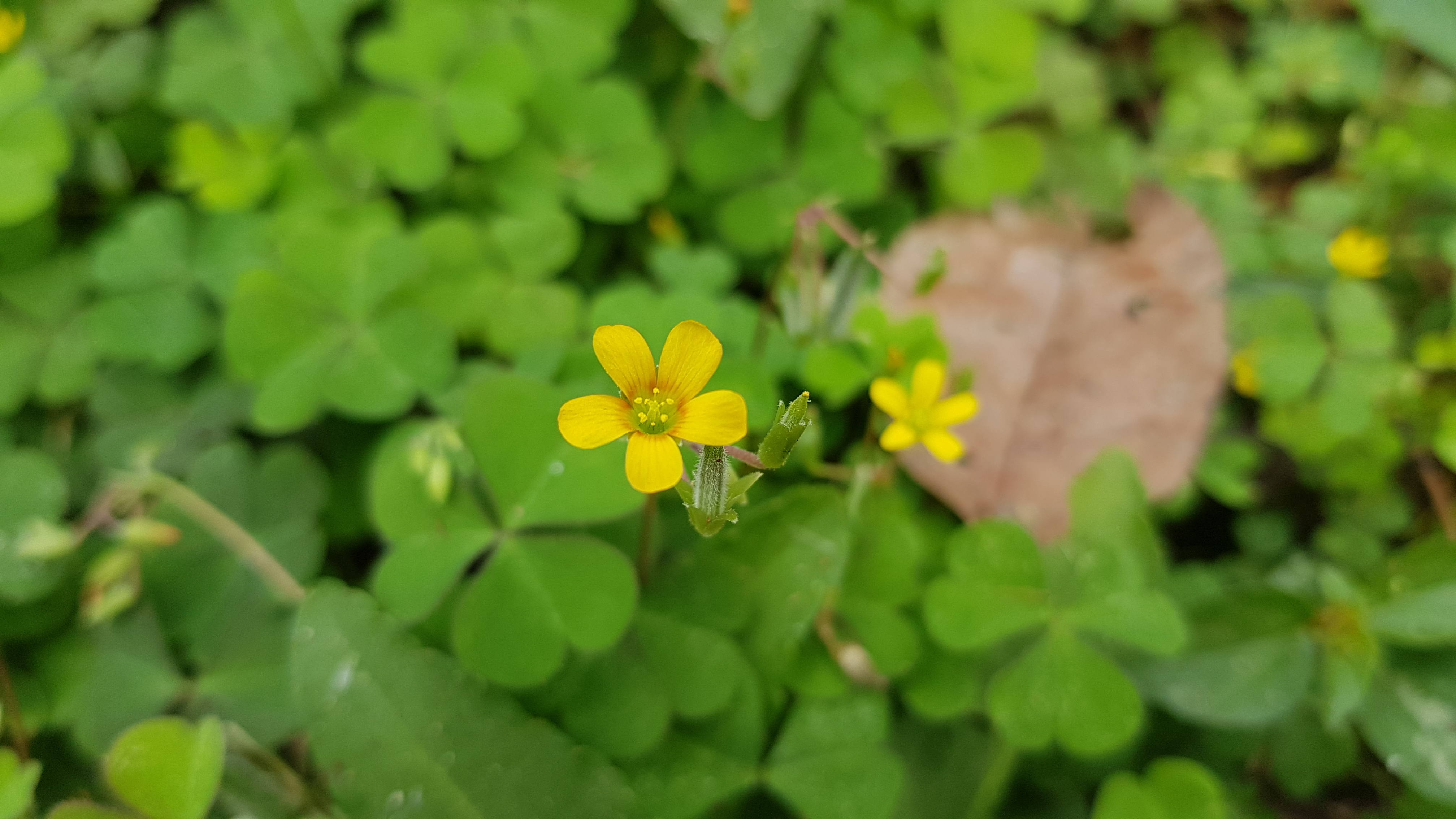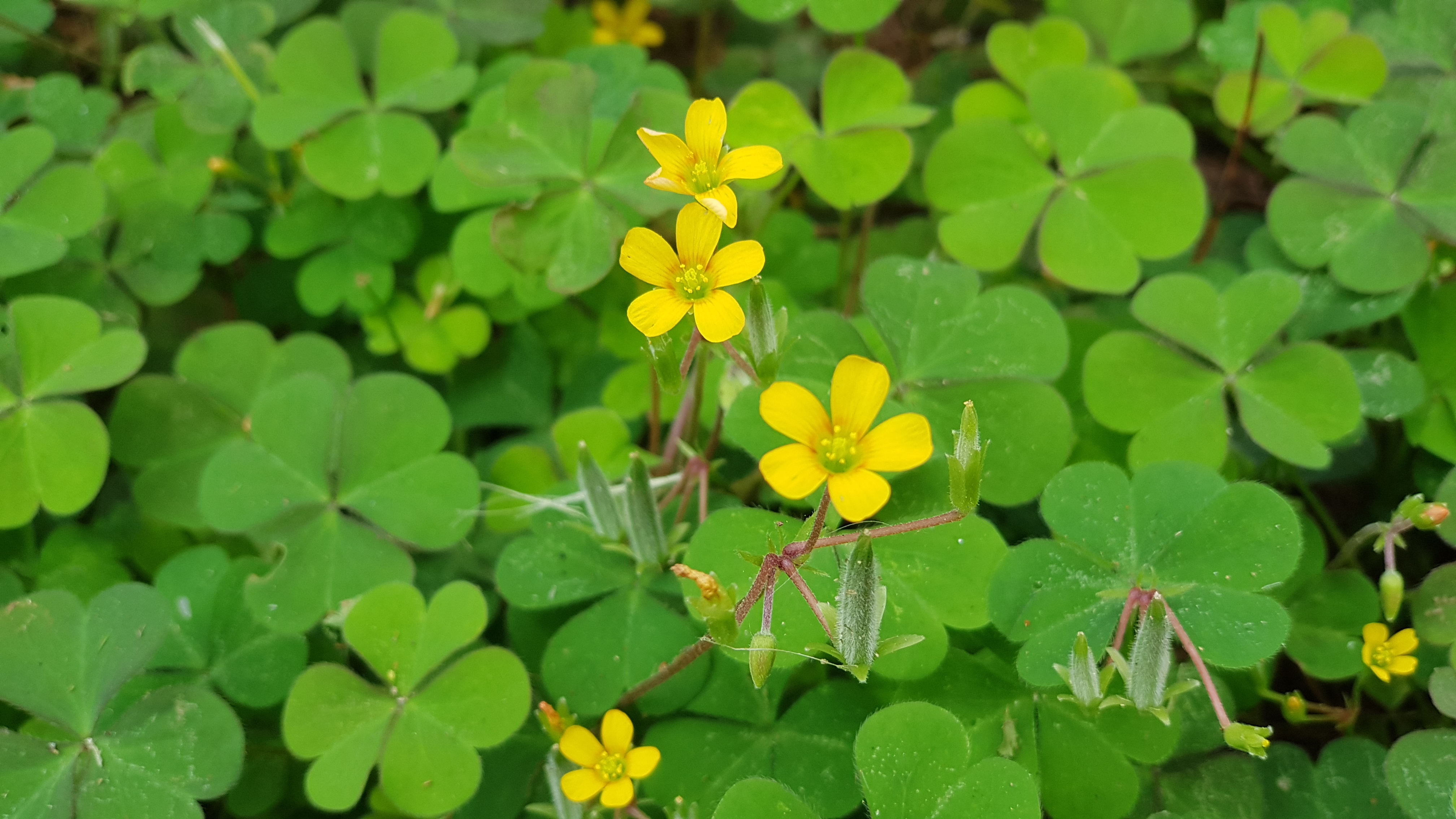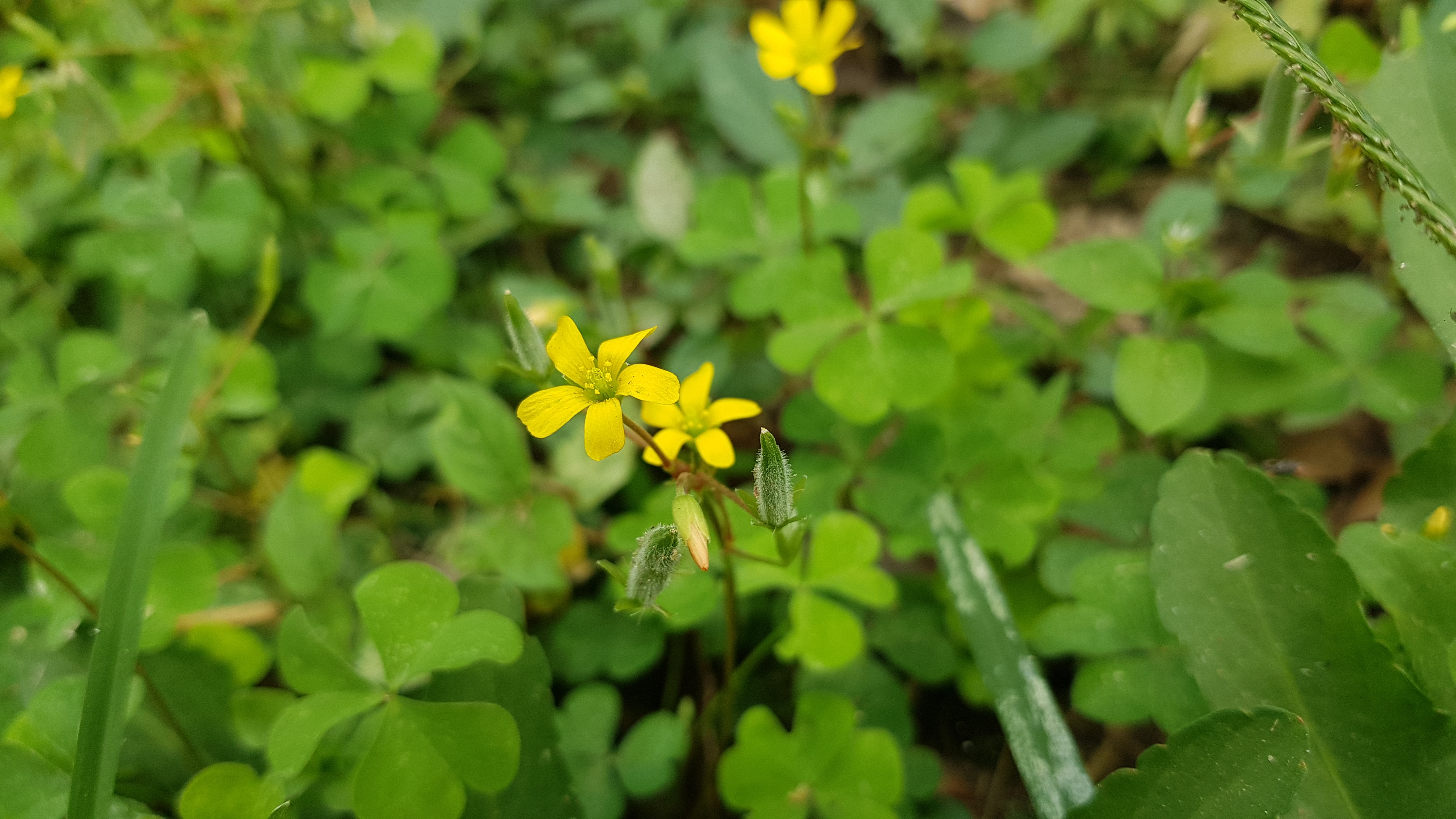 황금빛 꽃을 피우며 그 존재감을 한껏 뽐내는 괭이밥. 잎사귀가 토끼풀과 비슷한데, 자세히 보면 둥근 타원형의 토끼풀 잎과 달리 괭이밥 잎은 딱 심장 모양이다.