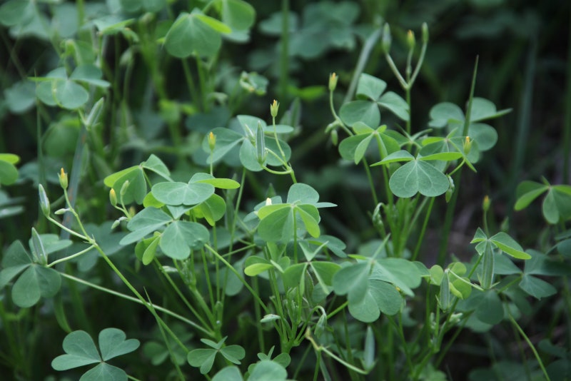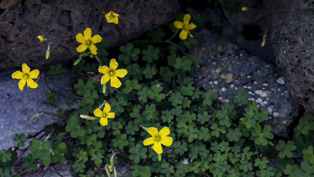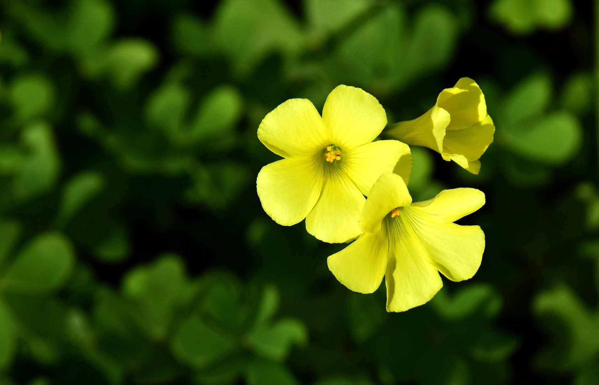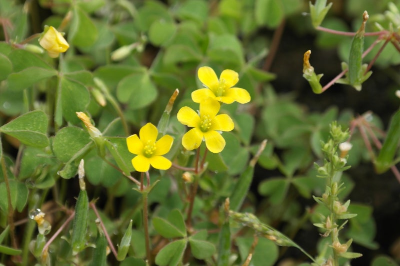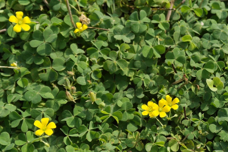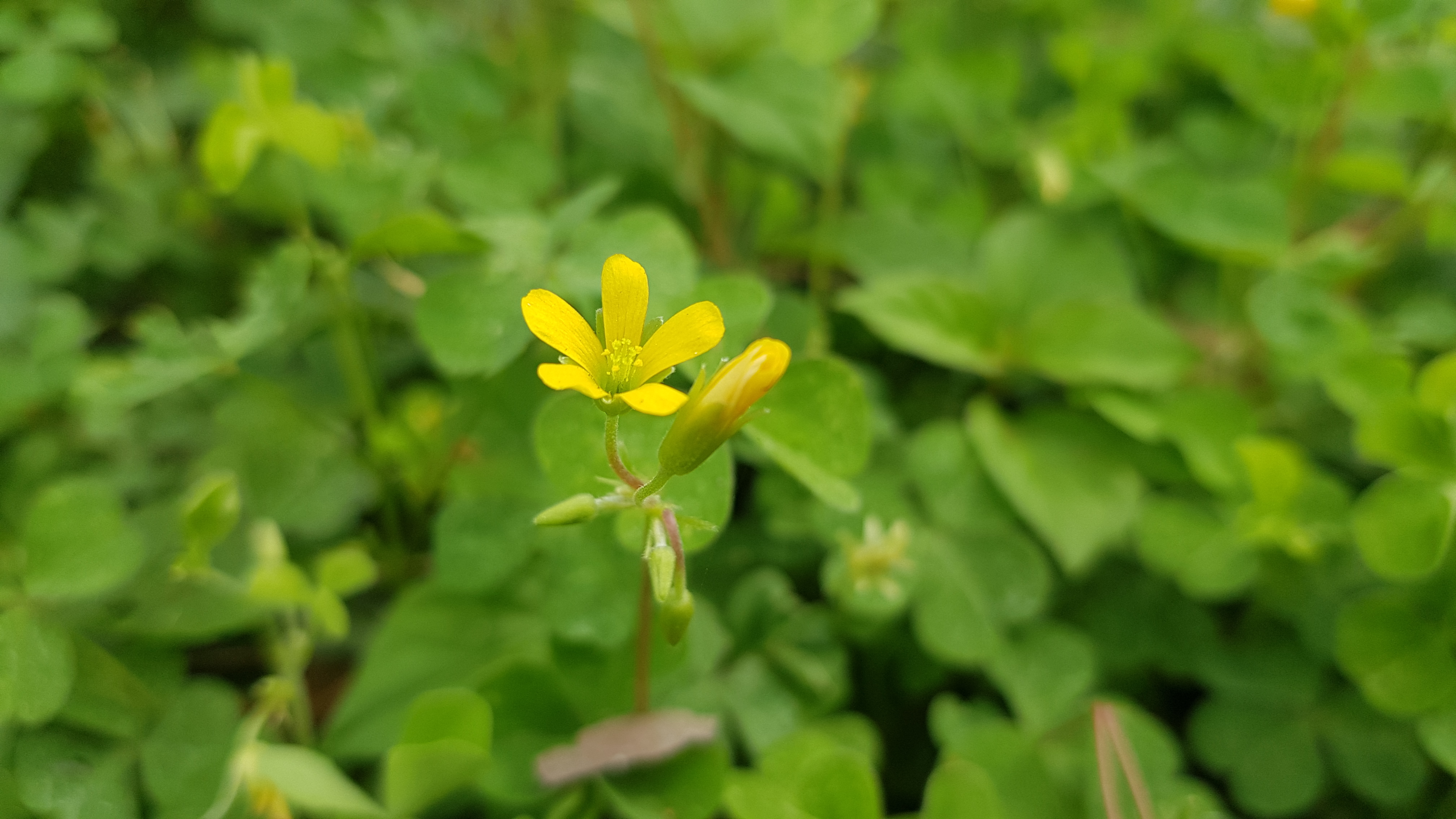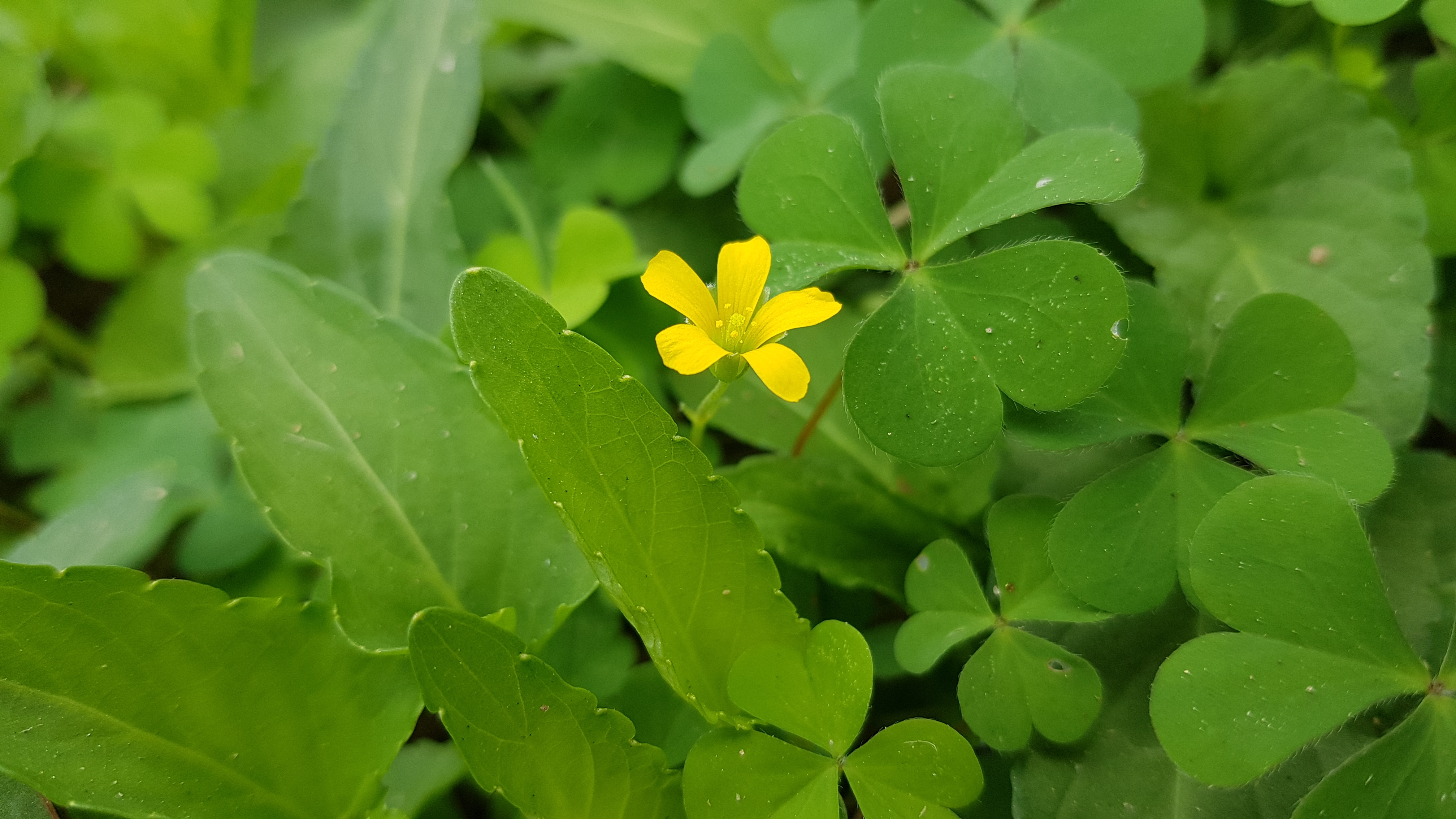 황금빛 꽃을 피우며 그 존재감을 한껏 뽐내는 괭이밥. 잎사귀가 토끼풀과 비슷한데, 자세히 보면 둥근 타원형의 토끼풀 잎과 달리 괭이밥 잎은 딱 심장 모양이다.