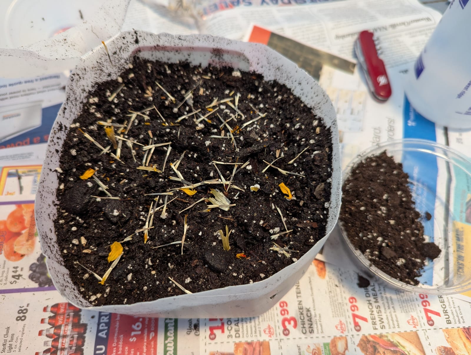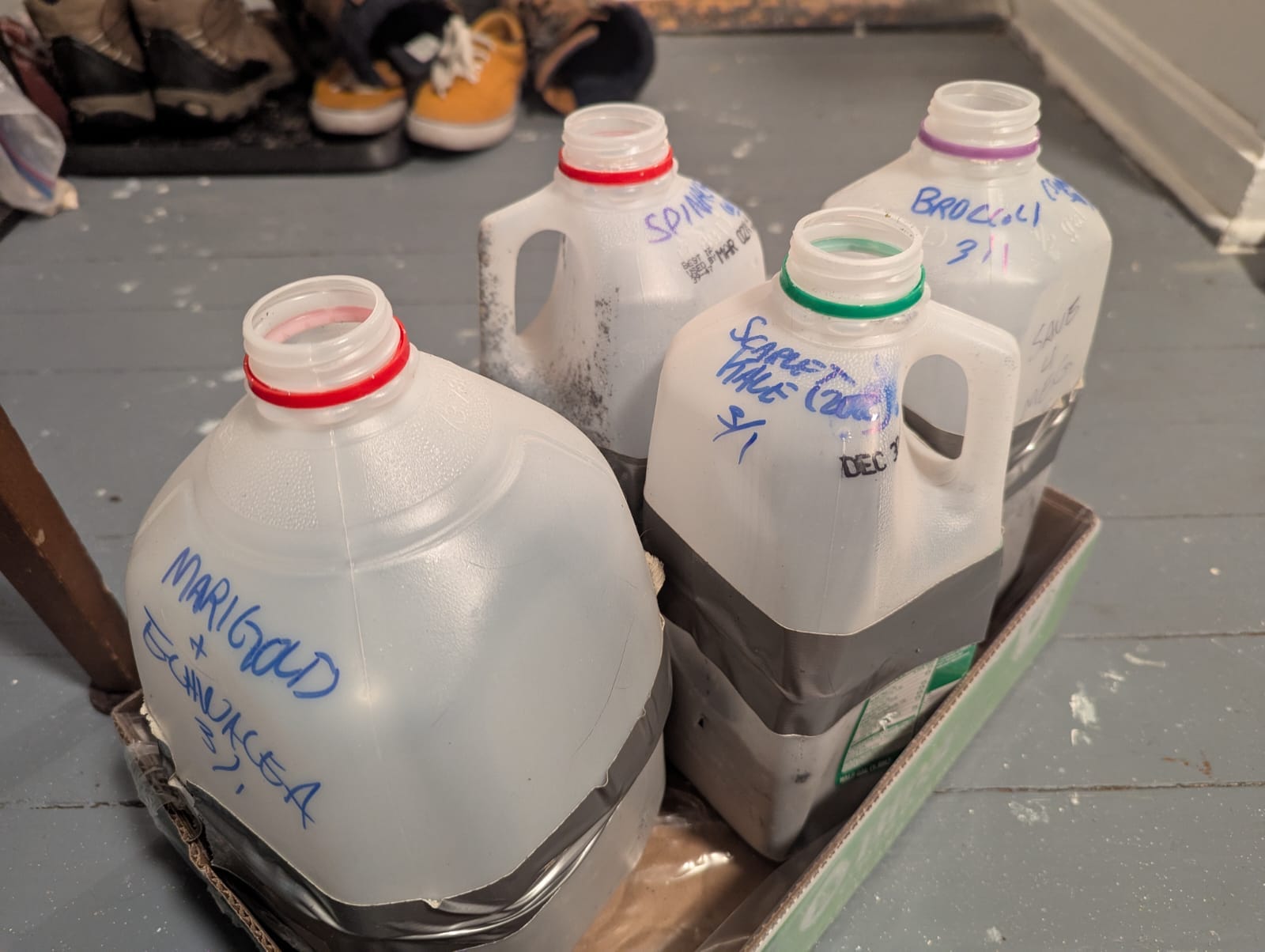 다시 말하지만, 이 작업을 하기에는 늦었지만, 어쨌든 시도하고 싶다면 빈 우유병(또는 물병, 투명 플라스틱), 날카로운 칼날, 화분용 흙, 덕트 테이프, 샤피만 있으면 됩니다.