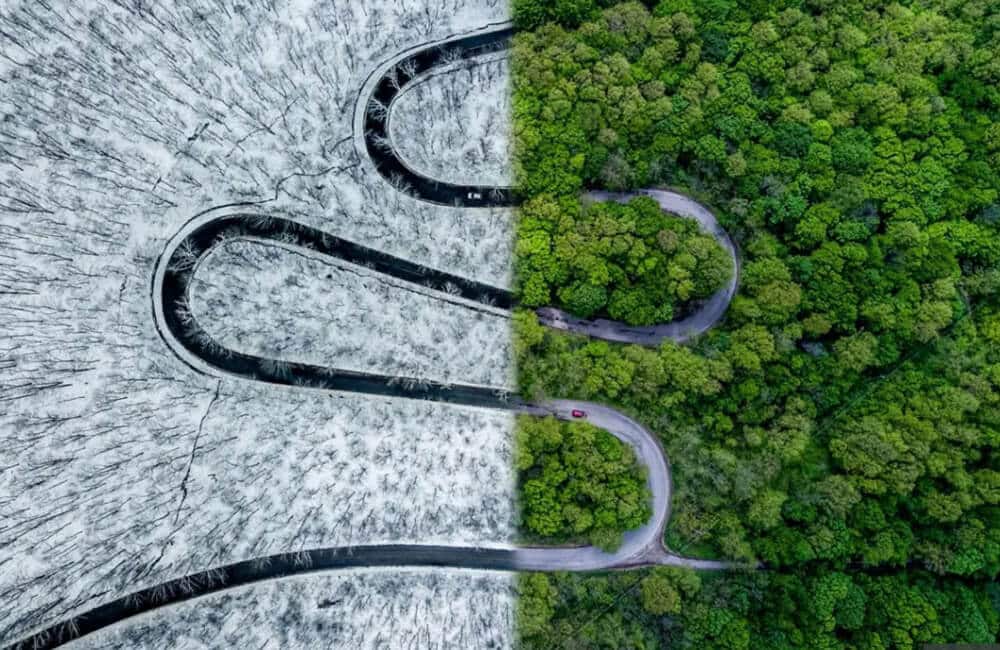@Smit가 우크라이나에서 촬영한 이 생생한 사진은 밝은 햇빛 아래 들판을 가로지르는 트랙터 줄을 보여줍니다. 아마도 여행객에게 편리해서 인기가 많은 DJI Mavic Mini 드론으로 촬영한 것 같습니다.