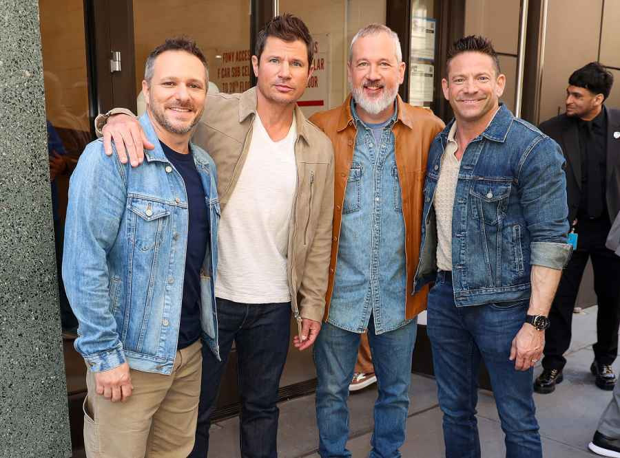 98 Degrees의 드류 레이시 , 닉 레이시 , 저스틴 제프리 , 제프 티몬스가 12년 만에 첫 앨범인 Full Circle 을 발매하기 전인 2025년 5월 7일 뉴욕에서 기자회견을 하며 함께 포즈를 취하고 있습니다.
