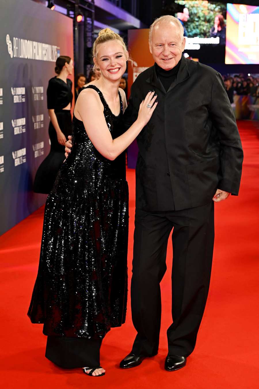 '센티멘탈 밸류'의 공동 주연 배우 엘르 패닝 과 스텔란 스카르스가드는 2025년 10월 12일에 열린 제69회 BFI 런던 영화제에서 미소를 지었다.
