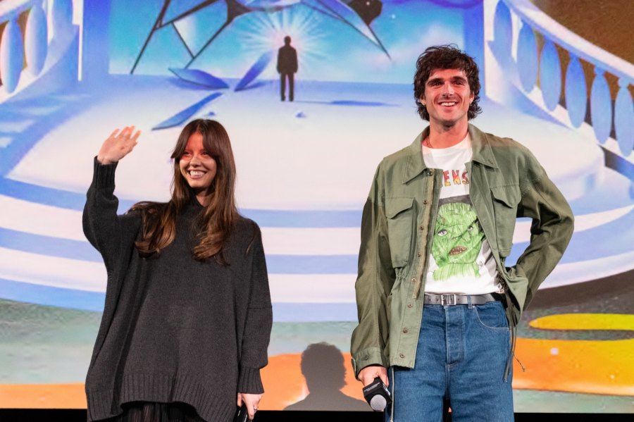 미아 고스 와 제이콥 엘로르디가 2025년 10월 5일 로스앤젤레스의 Beyond Fest에서 열린 프랑켄슈타인 의 아메리카 시네마테크 상영에서 팬들에게 손을 흔들었습니다 .