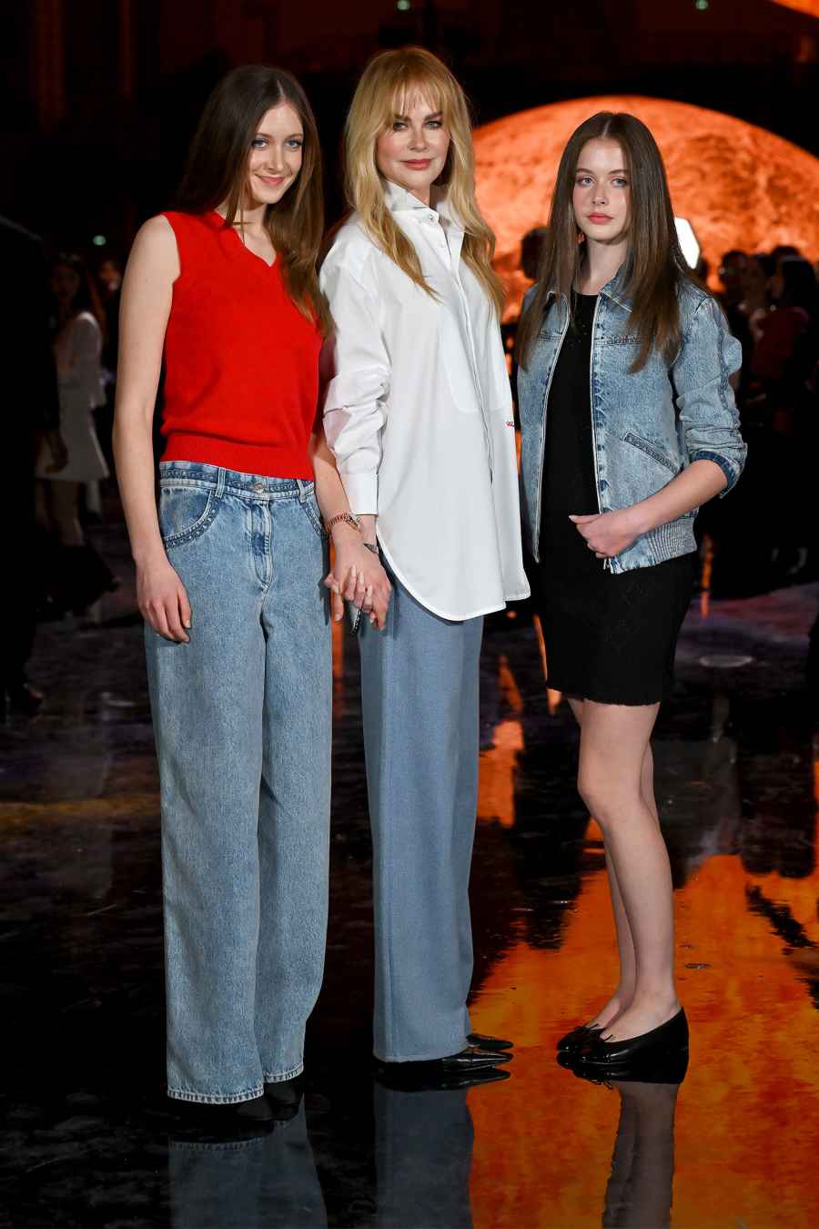 니콜 키드먼 과 그녀의 두 딸 선데이 로즈 와 페이스 마가렛 키드먼 어번은 2025년 10월 6일 파리 패션 위크 중 샤넬 쇼에서 데님을 입고 쌍둥이 자매가 되었습니다.