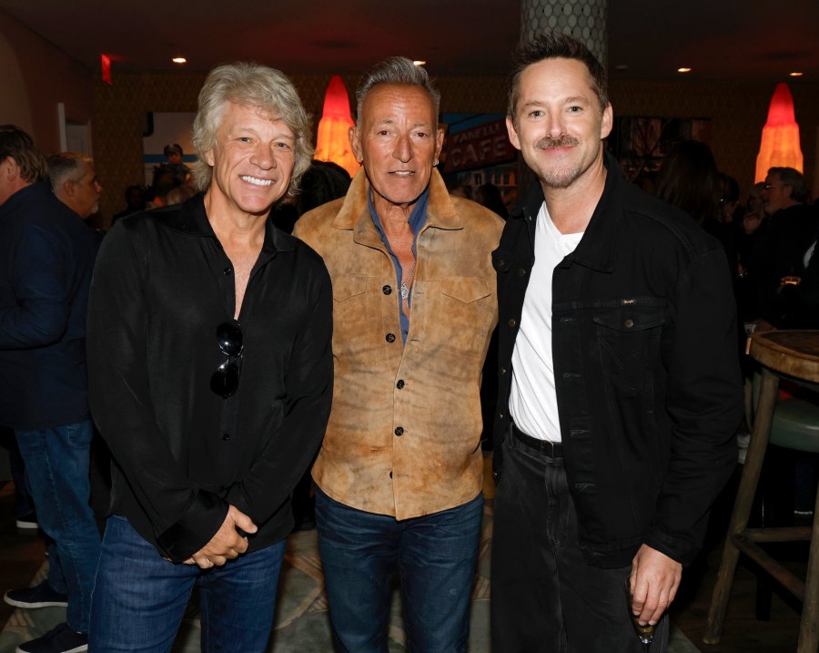 존 본 조비 와 브루스 스프링스틴은 2025년 10월 1일 뉴욕시에서 열린 전기 영화 Springsteen: Deliver Me From Nowhere 의 특별 상영회에서 감독인 스콧 쿠퍼 와 함께 사진을 찍었습니다