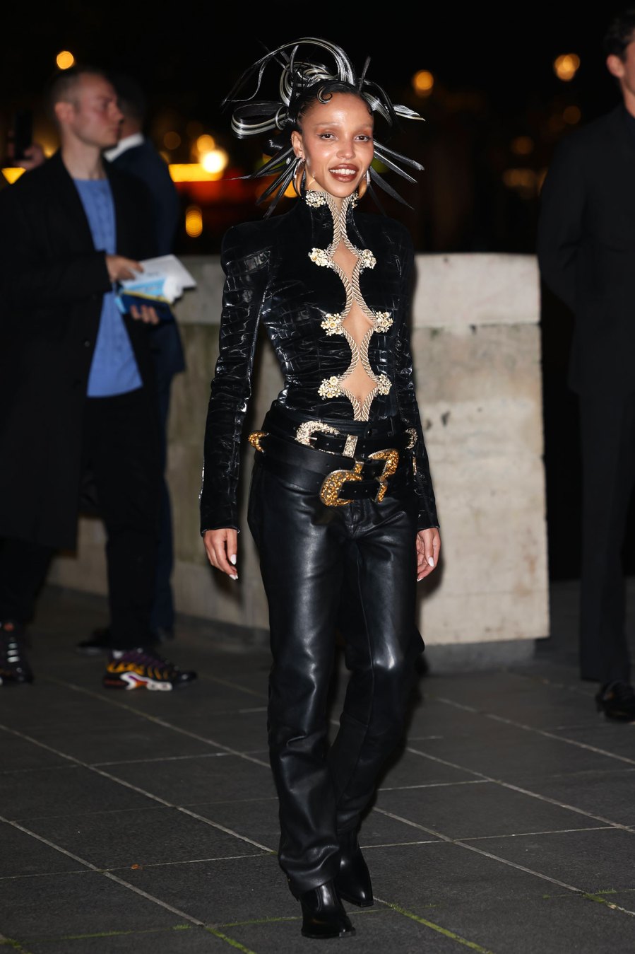 FKA 트위그스는 2025년 10월 2일 파리 패션 위크에서 열린 2026년 봄/여름 시아파렐리 여성복 쇼에서 독특한 앙상블을 선보였습니다.