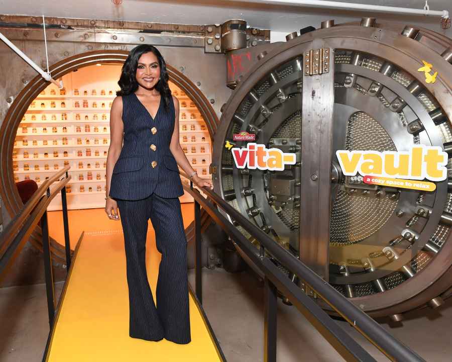민디 캘링은 2025년 10월 7일 뉴욕시의 Nature Made 웰니스 체험 팝업에서 핀스트라이프 슈트 룩을 선보였습니다.