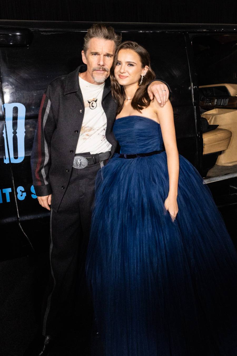 블랙폰 2 의 이선 호크 와 매들린 맥그로는 2025년 10월 8일 로스앤젤레스에서 열린 공포 속편 시사회에서 사진을 찍었습니다.