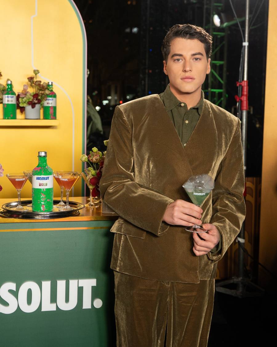 Next Gen NYC 의 브룩스 마크스는 2025년 11월 17일 뉴욕에서 열린 위키드: 포 굿 시사회 의 노란 벽돌길 테마 레드카펫에서 앱솔루트 x 스릴리파잉! 트위스트 칵테일을 마셨습니다 .