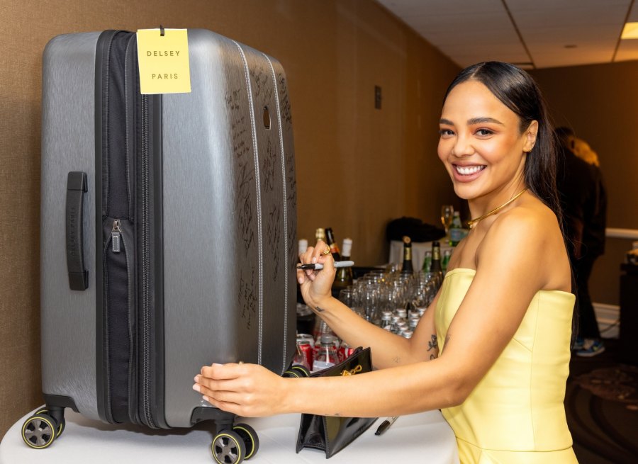 테사 톰슨이 2025년 11월 20일 로스앤젤레스에서 열린 마이클 B. 조던을 기리는 아메리칸 시네마테크 갈라에서 자선 단체인 야아마바 리조트의 델시 파리 러기지에 사인을 하고 있다