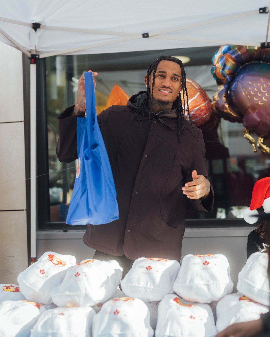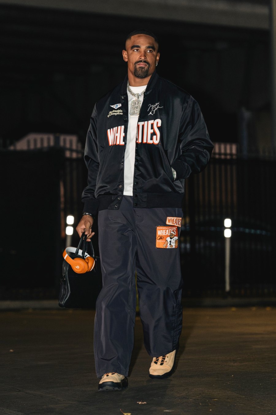 젤렌 허츠는 2025년 11월 16일 필라델피아에서 산책을 하면서 전국적인 "챔피언의 아침 식사" 박스 출시를 앞두고 휘티스에서 영감을 받은 룩을 선보였습니다.