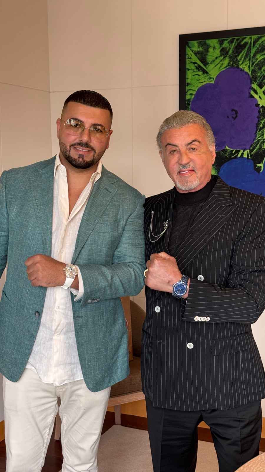 2025년 11월 털사 킹 시즌 3 기자 투어에서 아비 하이 에브와 실베스터 스탤론이 다이얼, 베젤, 브레이슬릿에 900개 이상의 천연 블루 사파이어가 세팅된 18K 화이트 골드 소재의 Avi & Co 블루 휴 시계를 착용하고 함께 포즈를 취했습니다.