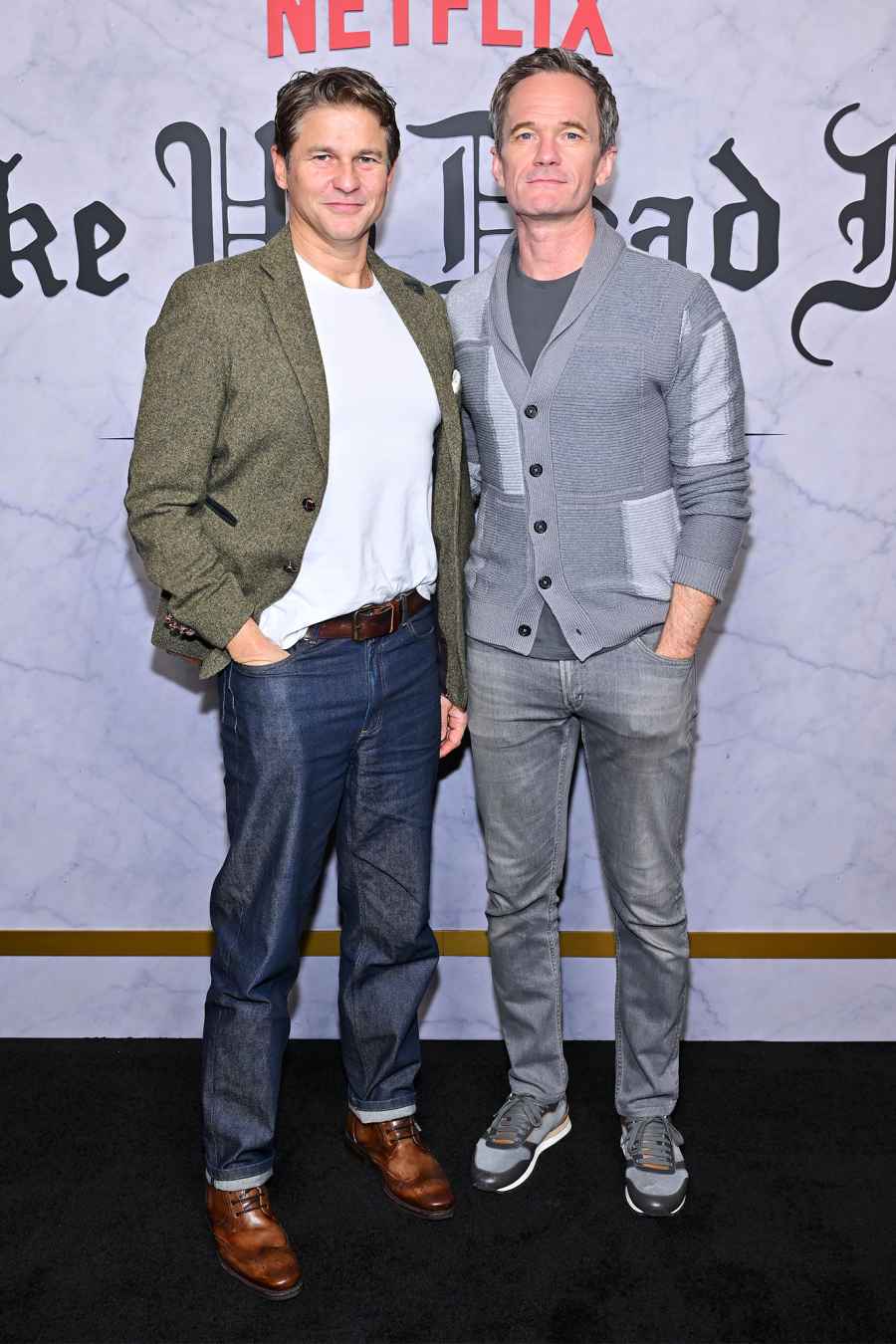 데이비드 버트카와 닐 패트릭 해리스가 2025년 11월 2일 뉴욕시에서 열린 Wake Up Dead Man 특별 상영회에서 사진을 찍었습니다 .