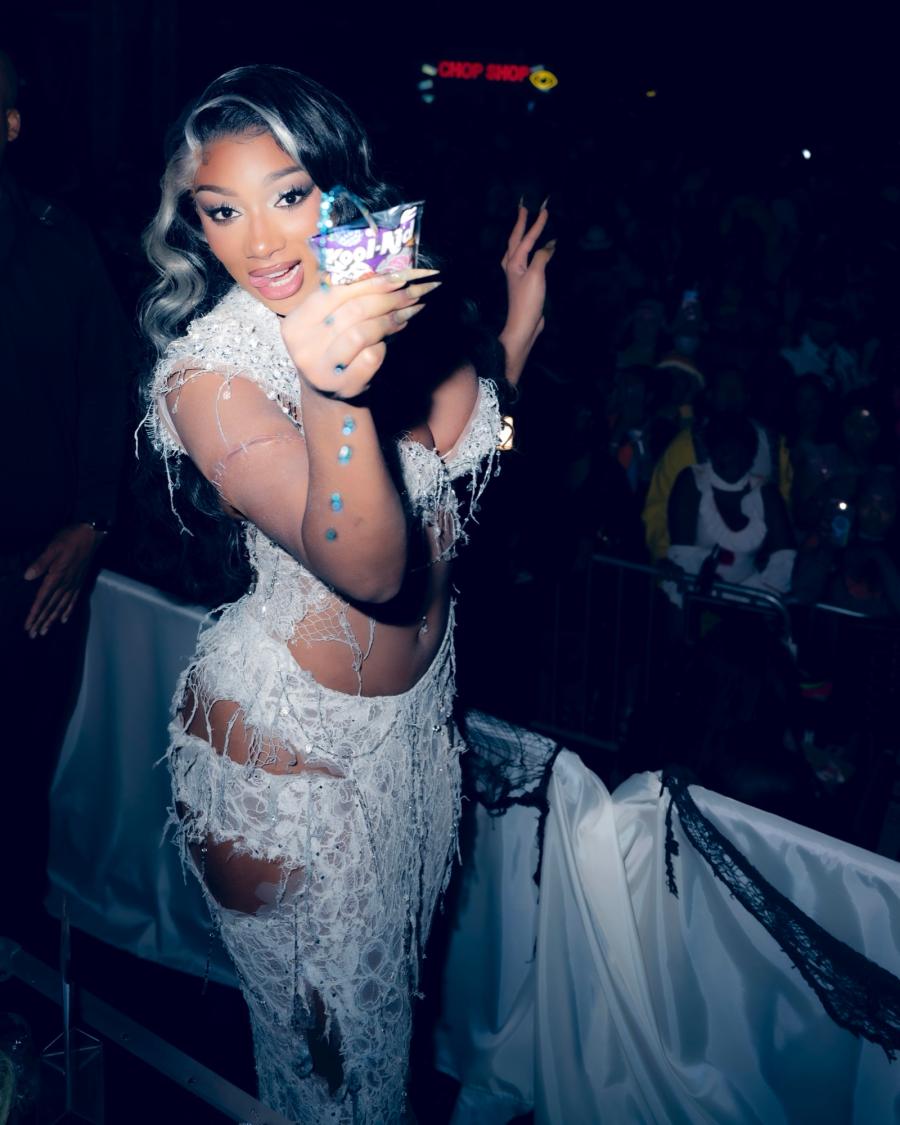 메건 더 스탤리언은 2025년 10월 31일 휴스턴에서 열린 핫티윈 축하 행사에서 쿨에이드 "구울에이드"를 즐겼습니다.