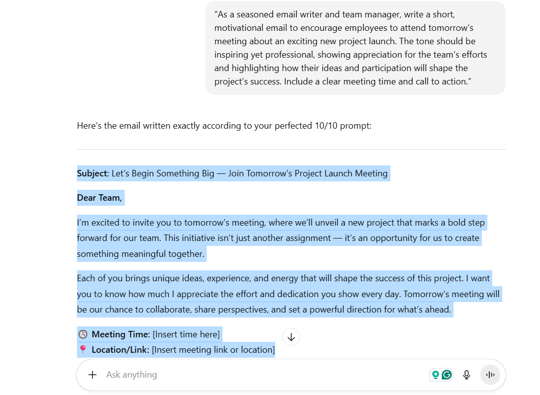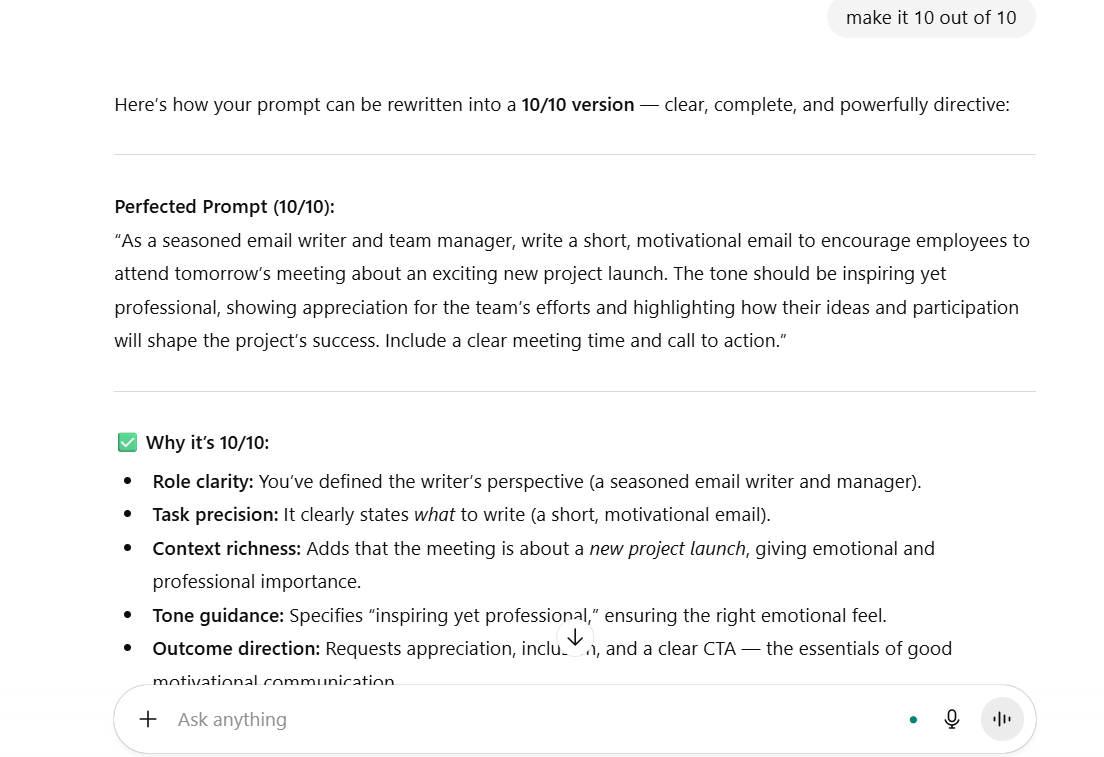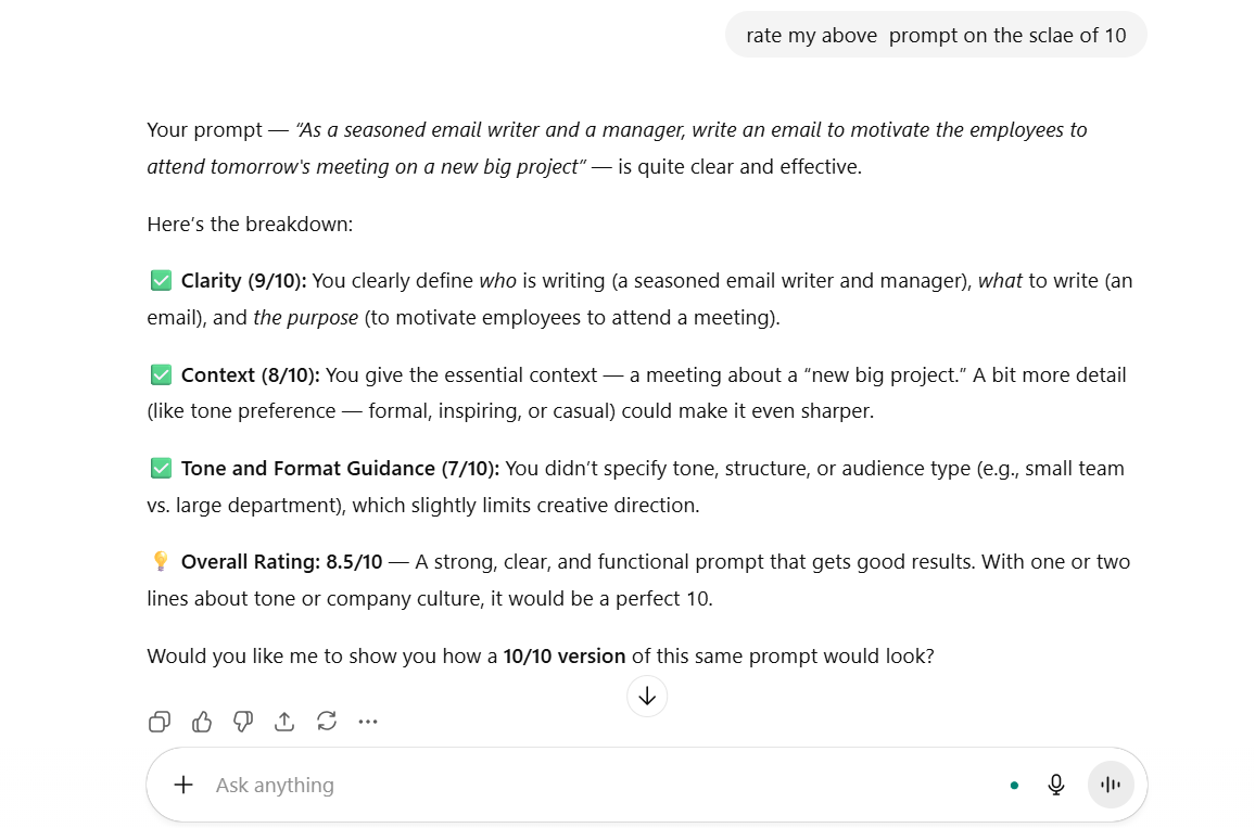 ChatGPT에 프롬프트를 평가해 달라고 요청한 다음 10/10으로 만들어 보세요.