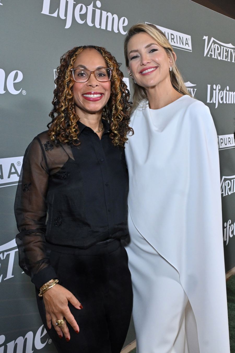 러닝 포인트 의 케이트 허드슨이 2025년 10월 29일 로스앤젤레스에서 열린 Variety 의 Power of Women 행사 에서 워너 브라더스 텔레비전 CEO 겸 회장 채닝 던지 와 함께 포즈를 취했습니다.