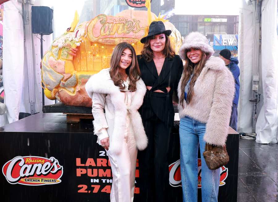 지아 지우디체 , 루앤 드 레셉스 , 돌로레스 카타니아는 2025년 10월 30일 뉴욕 타임스 스퀘어에서 열린 Raising Cane의 미국 최대 호박 공개 행사에 참석했습니다.