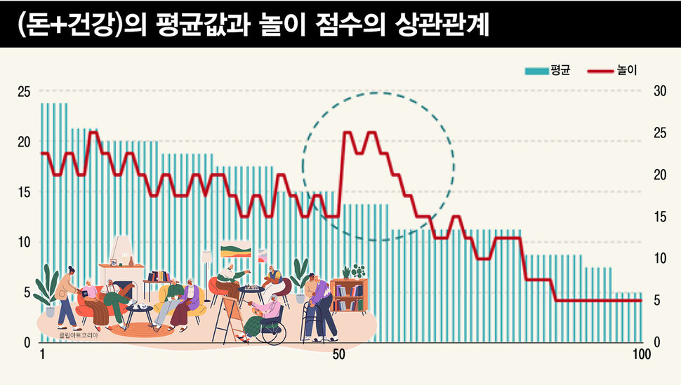 전체적으로 놀이 점수가 돈+건강의 평균값보다 낮다는 것을 알 수 있다.