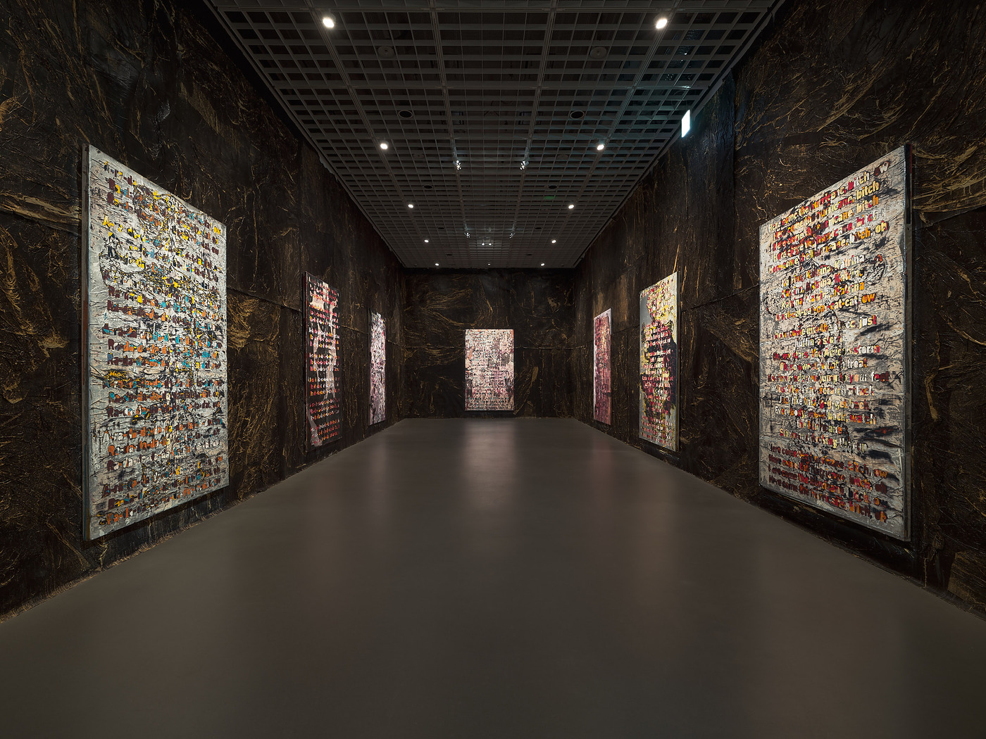 거리에서 수집한 전단지, 신문지 등 도시의 부산물이라 할 수 있는 흔한 재료를 겹겹이 쌓고, 긁어내고, 찢어내는 제작 방식은 회화의 표면을 매우 역동적으로 조직합니다.