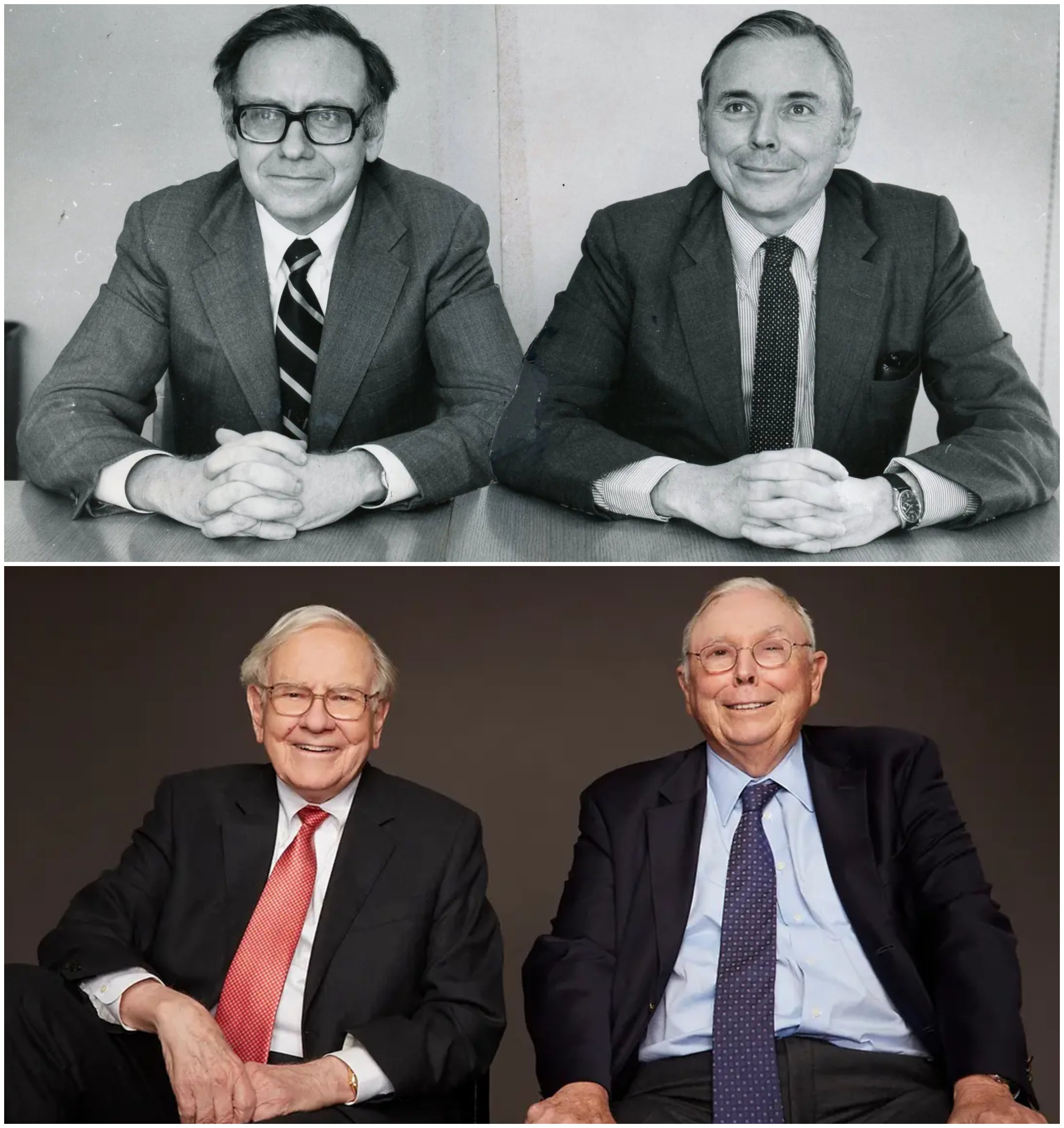 워런 버핏과 찰리 멍거: 1970년대 중후반(위), 2020년대 초반(아래) 버핏은 종종 멍거에 대해 "그는 건축가였고, 나는 총괄 시공자였다"고 말했다.