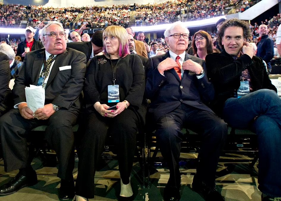 버핏의 자녀들: 버핏(오른쪽에서 두 번째)이 자녀인 하워드, 수지, 피터(왼쪽부터)와 함께 2011년 네브래스카 오마하에서 열린 주주총회에 참석한 모습. (게티이미지)