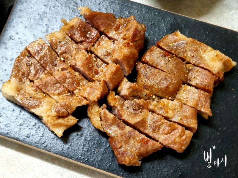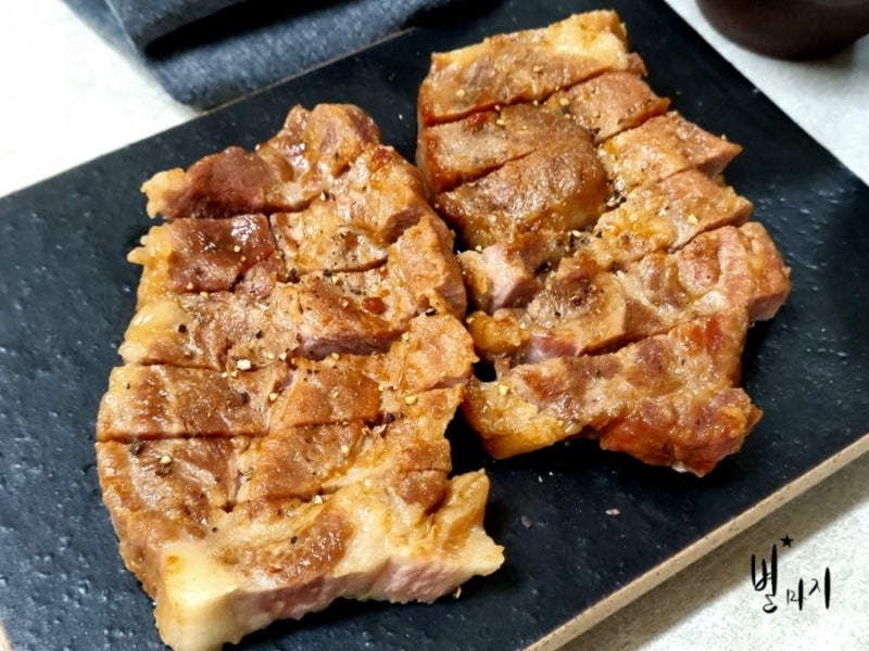 이 과정에서 목살의 지방이 녹아 나오며 살코기 사이를 촉촉하게 채운다.