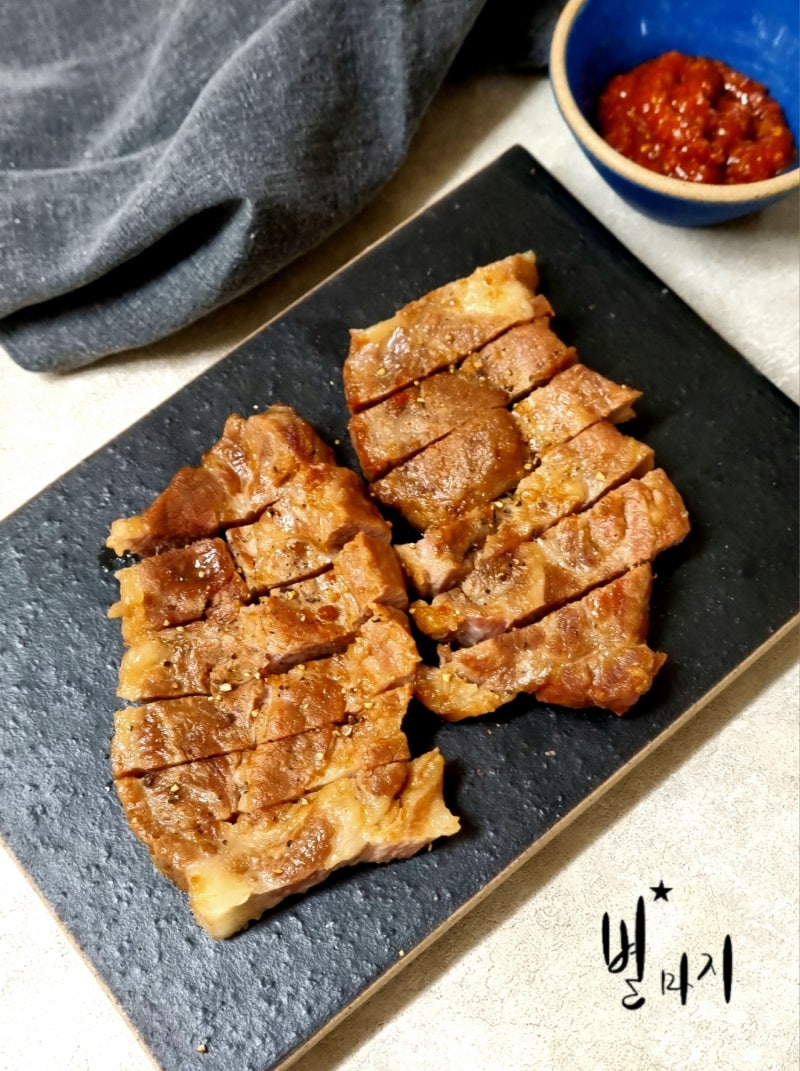 목살은 흐르는 물에 가볍게 씻은 뒤 키친타월로 물기를 제거하고, 겉면에 소금과 후추를 살짝 뿌려 밑간을 해둔다.