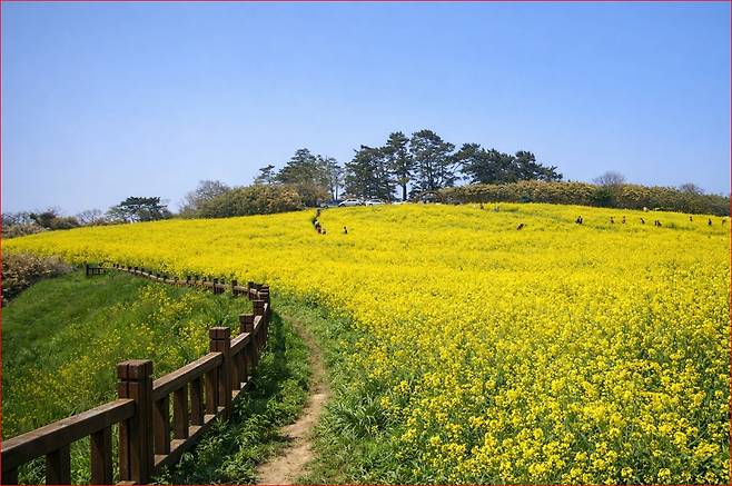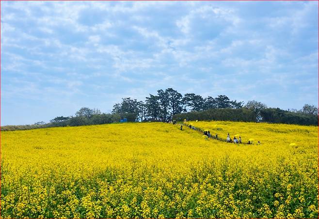 3월 중순이면 땅 가까이 피어오른 유채꽃이 들판을 뒤덮으며, 멀리 수평선과 맞닿은 풍경이 한 폭의 그림처럼 펼쳐진다.