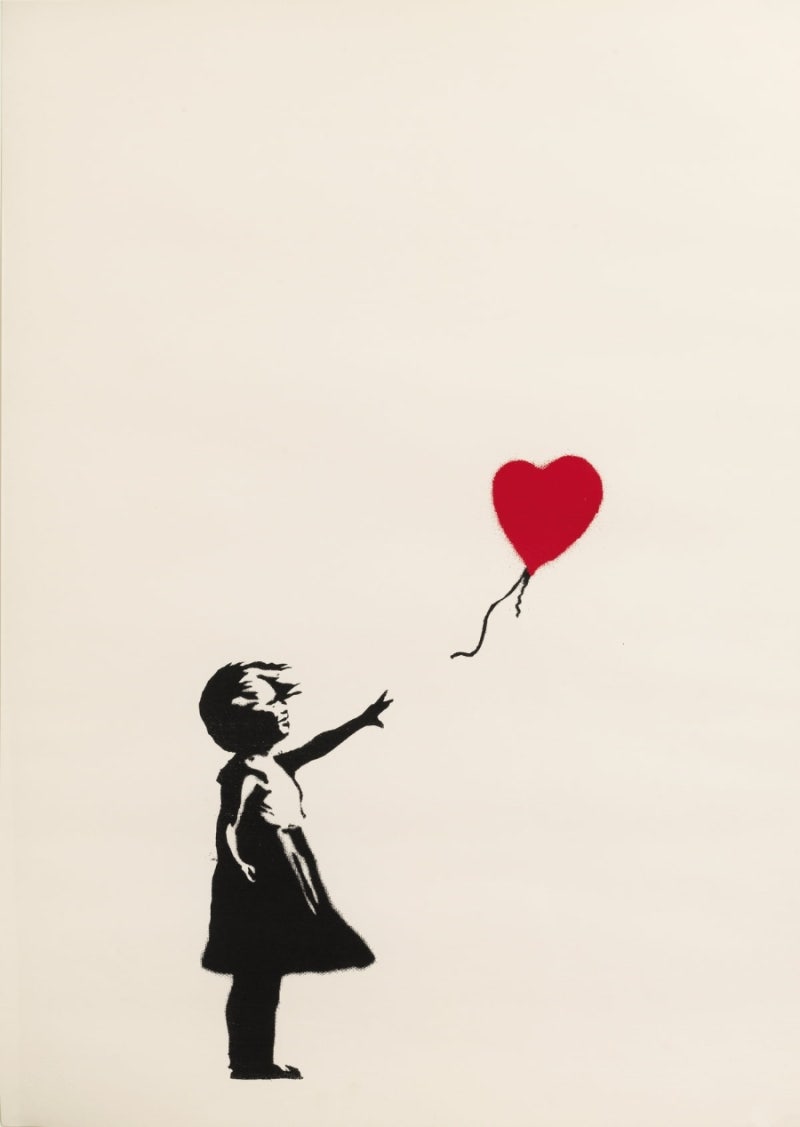 〈풍선을 든 소녀〉(Girl with Balloon, 2002) — 붉은 하트 풍선을 향해 손을