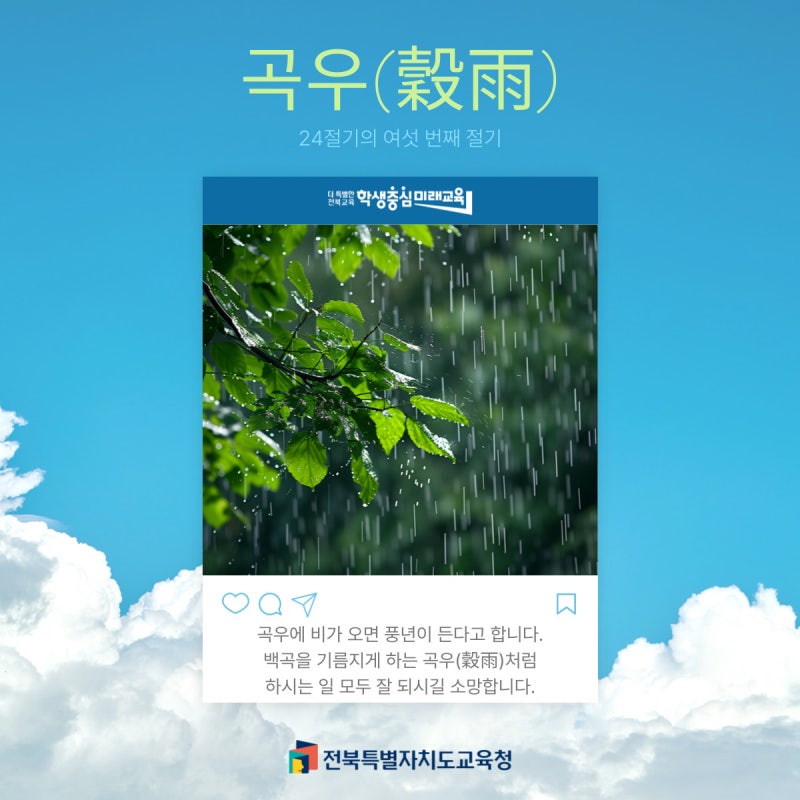 '곡(穀)'은 곡식, '우(雨)'는 비를 뜻하며, 이 시기의 비가 농작물 생장에 결정적 역할을 한다는 뜻입니다